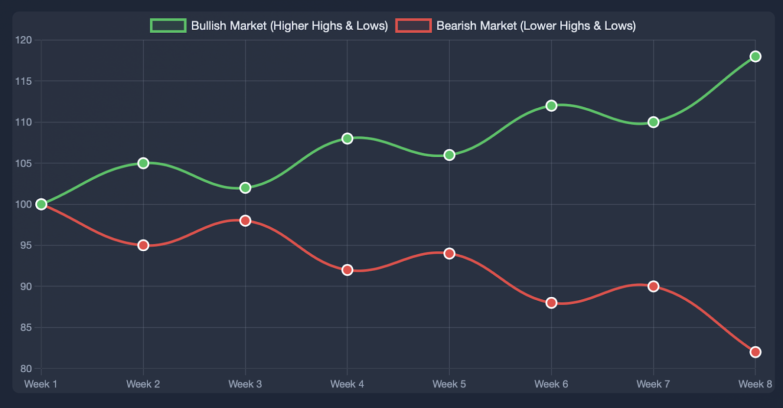 Now let's get clear on what market conditions characterize a bullish market. A bullish market is a market environment where prices consistently trend upward based on what technical analysts refer to as "higher highs and higher lows." These peaks and valleys create patterns that seem like staircases, with each peak and valley above previous peaks and valleys.