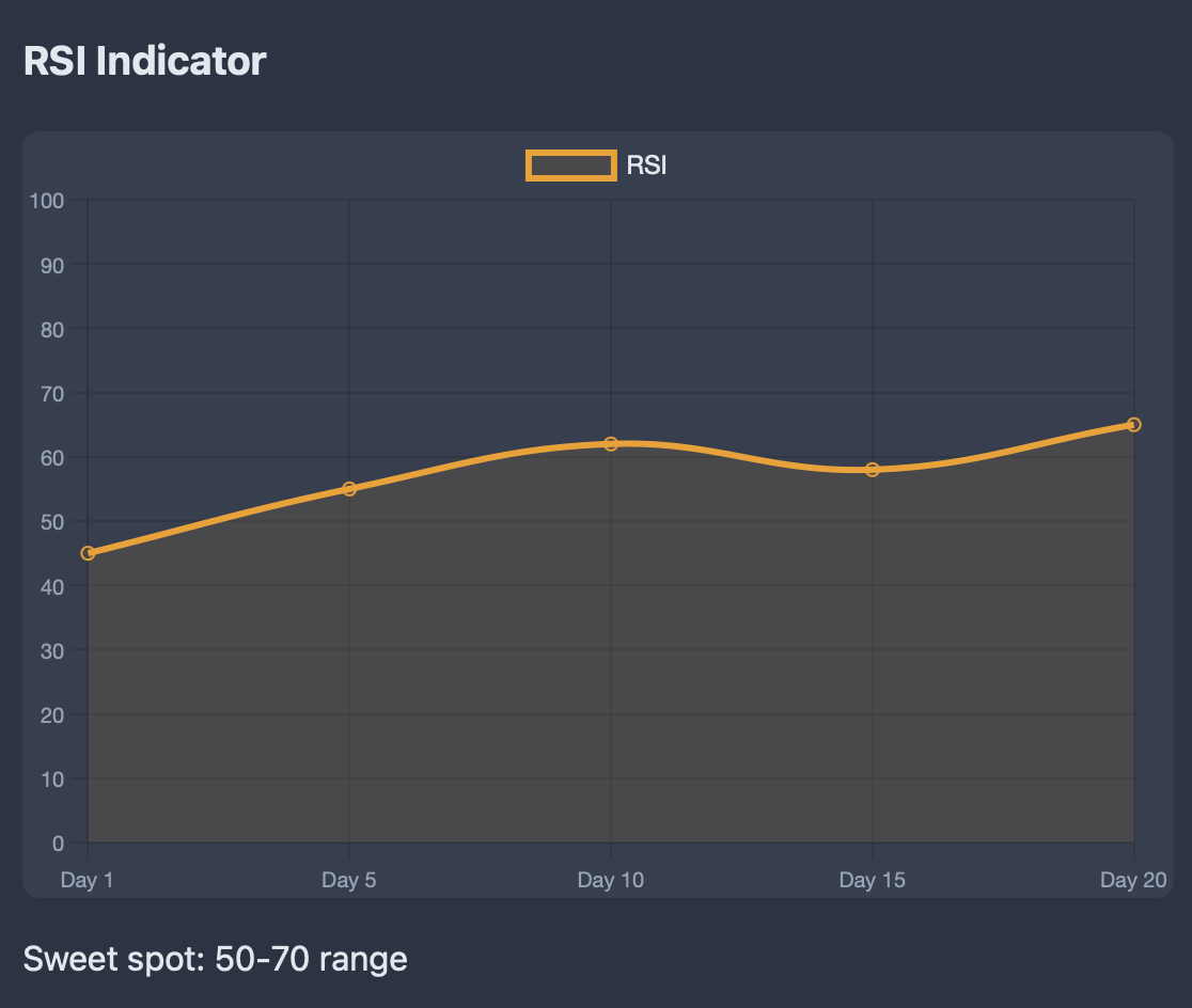 Relative Strength Index (RSI) reading above a value of 50 indicates bullish momentum. The sweet spot would be readings between 50-70, when the market continues to show strength and the market isn't overbought.