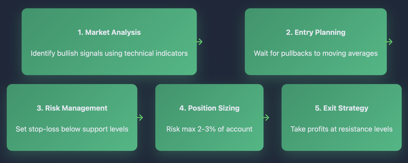 The important thing to remember is that a bullish market combines price action with technical confirmation and positive sentiment. It's not just about numbers going up, it's about the overall market environment supporting continued growth.