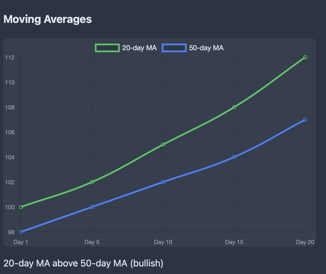 Moving Averages (MA) over time continue to trend upward as well. A strong bullish market would have a 20-day moving average above the 50-day moving average (> both upward trending).