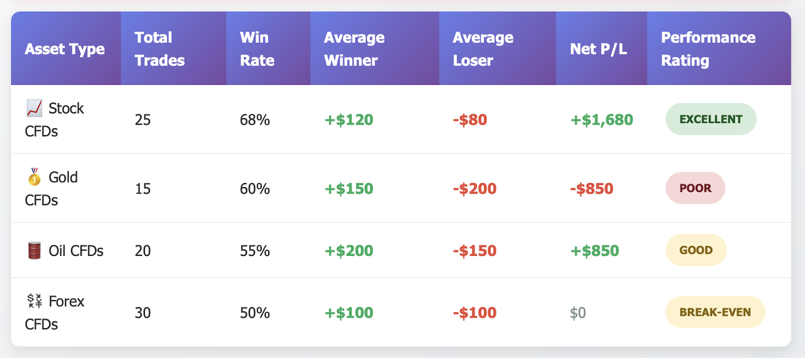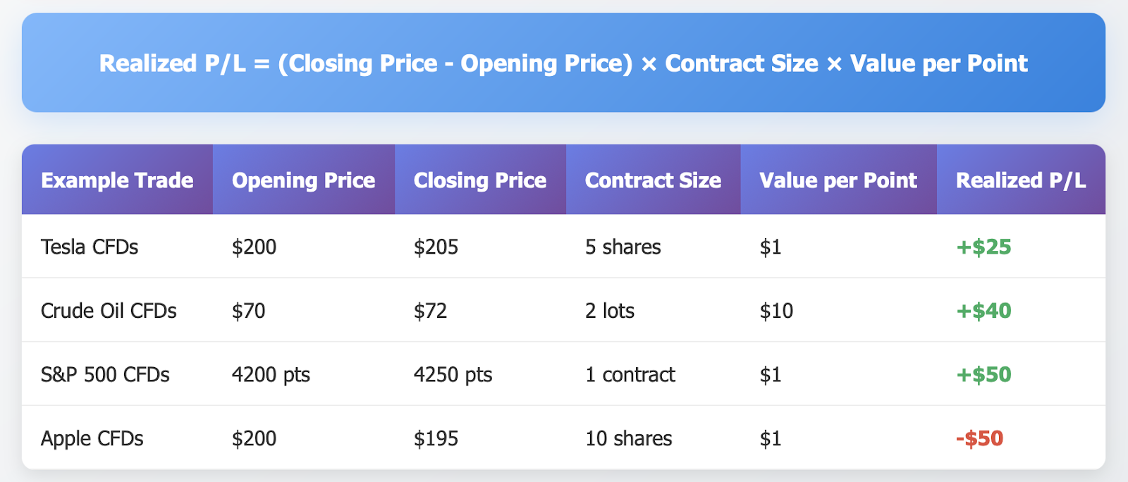 Professional Example: A trader buys 2 lots of crude oil CFDs at $70 per barrel and closes at $72 per barrel. If one point equals $10 the formula is: Realized P/L = (72 - 70) × 2 × 10 = $40 profit