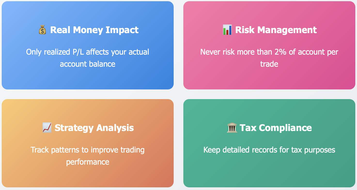 Be cognizant of the practical implications of realized profit. Taxes, compliance, and record keeping all become important as you begin to generate realized P/L.