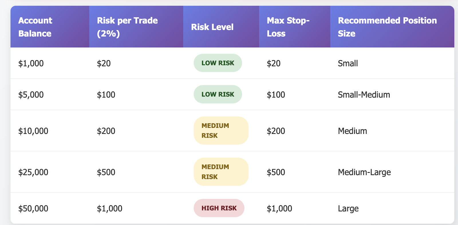 Beginner Example: John has risked only $50 per trade regardless of the position size. This way, even if dozens of trades go against him, his account will have taken only a minor hit.