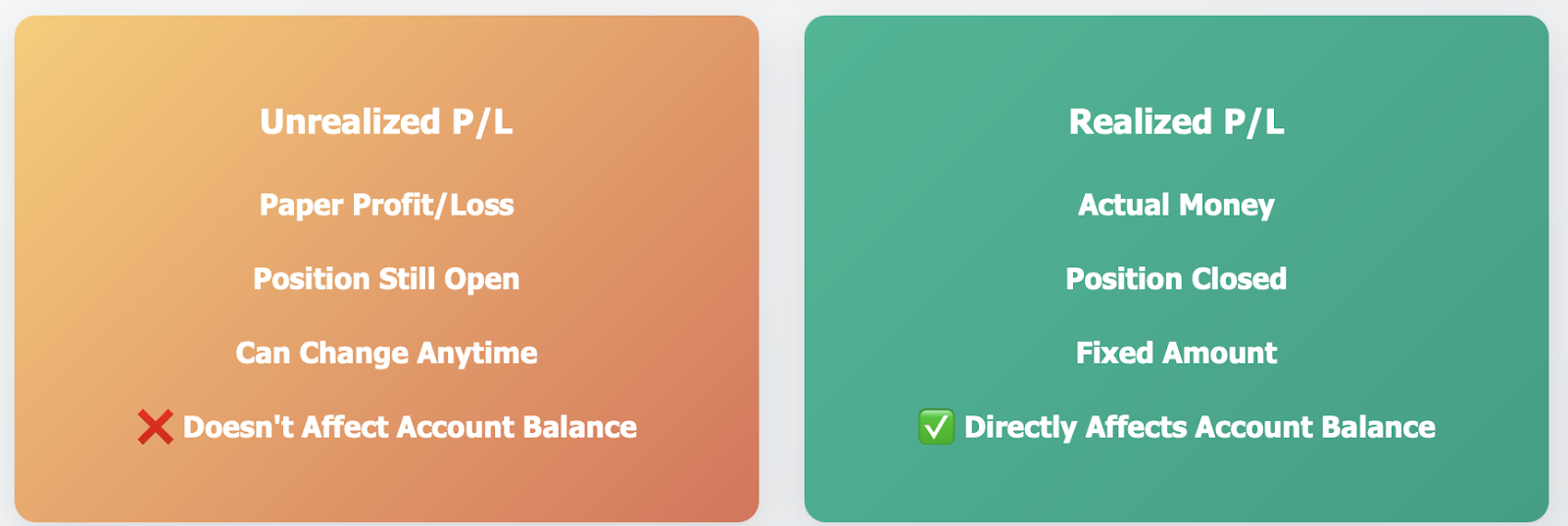 What's the difference? Only realized P/L has an effect on your actual account balance. Unrealized profits can disappear if the price is moving against you while you have that position open.
