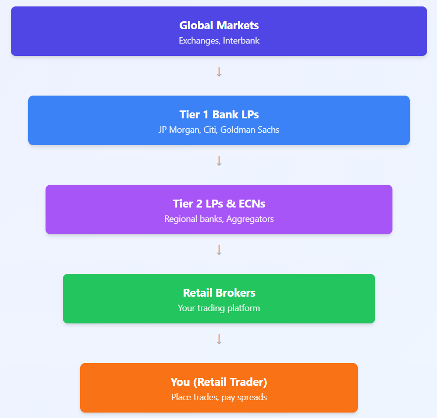The liquidity flow looks like this, starting from and ancillaries of global markets (exchanges, interbank) → to tier 1 bank lp's that either price in the aggregate, or manage your risk - in either case those LPs must add an additional layer of spread → Tier 2 LPs and ECNs who add more liquidity, or price specialized or esoteric asset classes → Retail brokers who provide the trading platform, and client interface → You who place the trades.