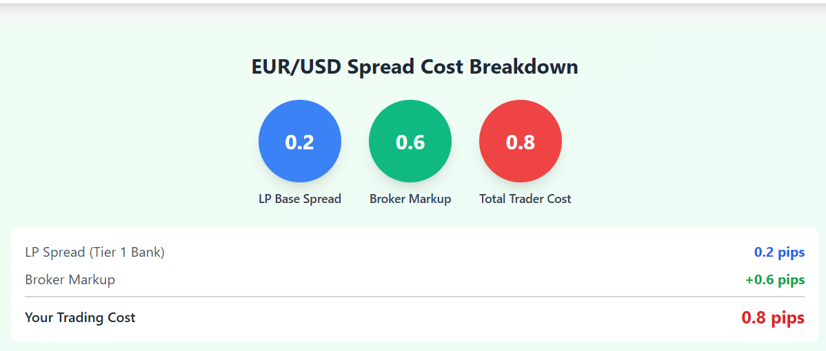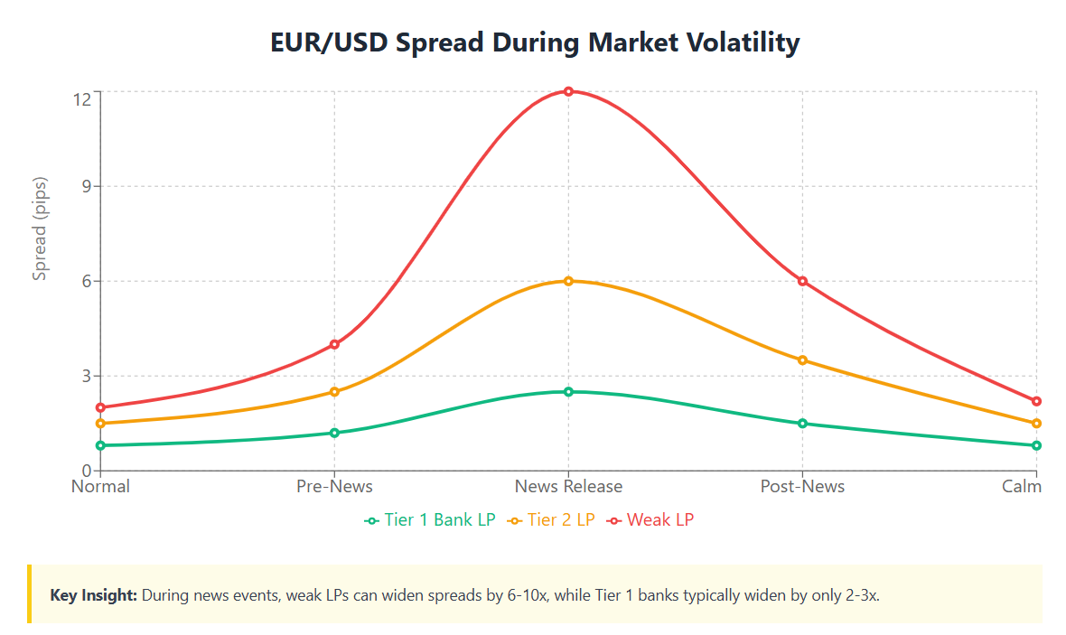 Example: A broker affiliated with multiple Tier 1 banks might display EUR/USD spreads of 0.8 pips in the calmest of markets and 2-3 pips during extreme volatility. A broker with weaker LP relationships might typically display 1.5 pips in normal conditions and then spiked to 10+ pips during the news. That's a big difference if you're an active trader.