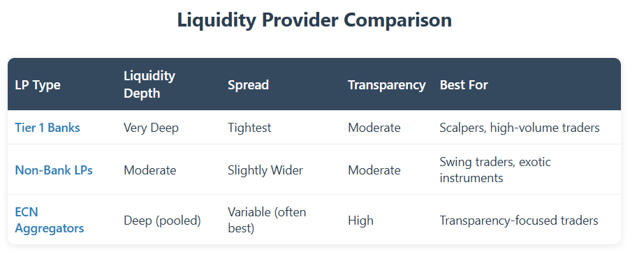When a broker states that it has "institutional-grade liquidity" or "Tier 1 bank connections," they are implying they are working with a high-quality LP. This implies that they will provide better prices, quicker fills, and less slippage than brokers that use lower-tier liquidity providers.
