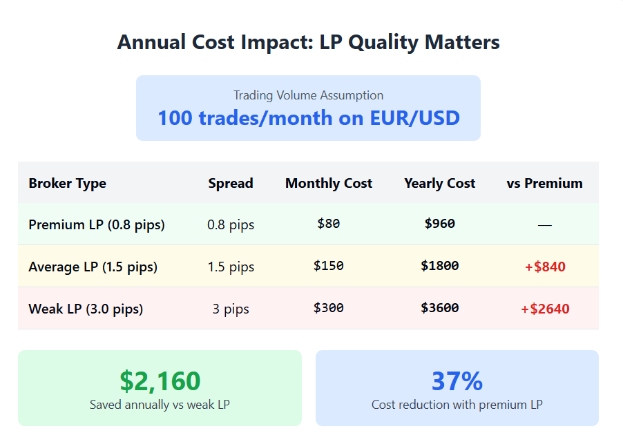 LP directly correlates with your cost of conducting trades; Brokers with connections to Tier 1 banks and ECN aggregators provide tighter spreads which add up over hundreds of trades. That 0.5 pip difference in EUR/USD spreads may in fact save an active trader thousands of dollars each year.