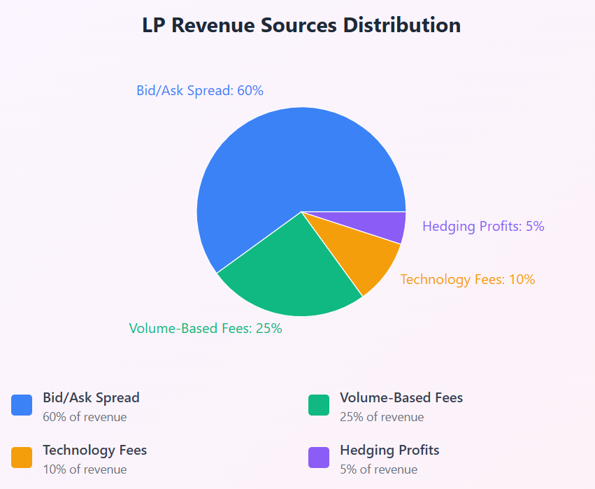 The LP profit model is directly tied to what you pay as a trader. The smaller the spread, the less the LP is making on each trade, and the only way to operate sustainably is at high volume. This is why Tier 1 banks can offer 0.5 pip spreads, they have enormous order flow that allows them to make these small margins per trade profitably.
