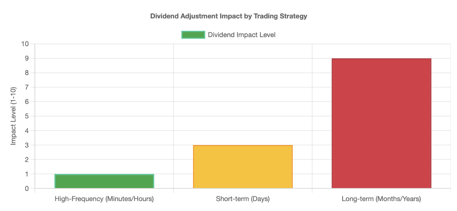 Various trading styles react to dividend adjustments in different ways. High-frequency traders usually remain unaffected because they generally close their positions within a matter of minutes or hours, which typically does not coincide with the enforced adjustment which happens once per quarter (rather than in real-time) for dividends.