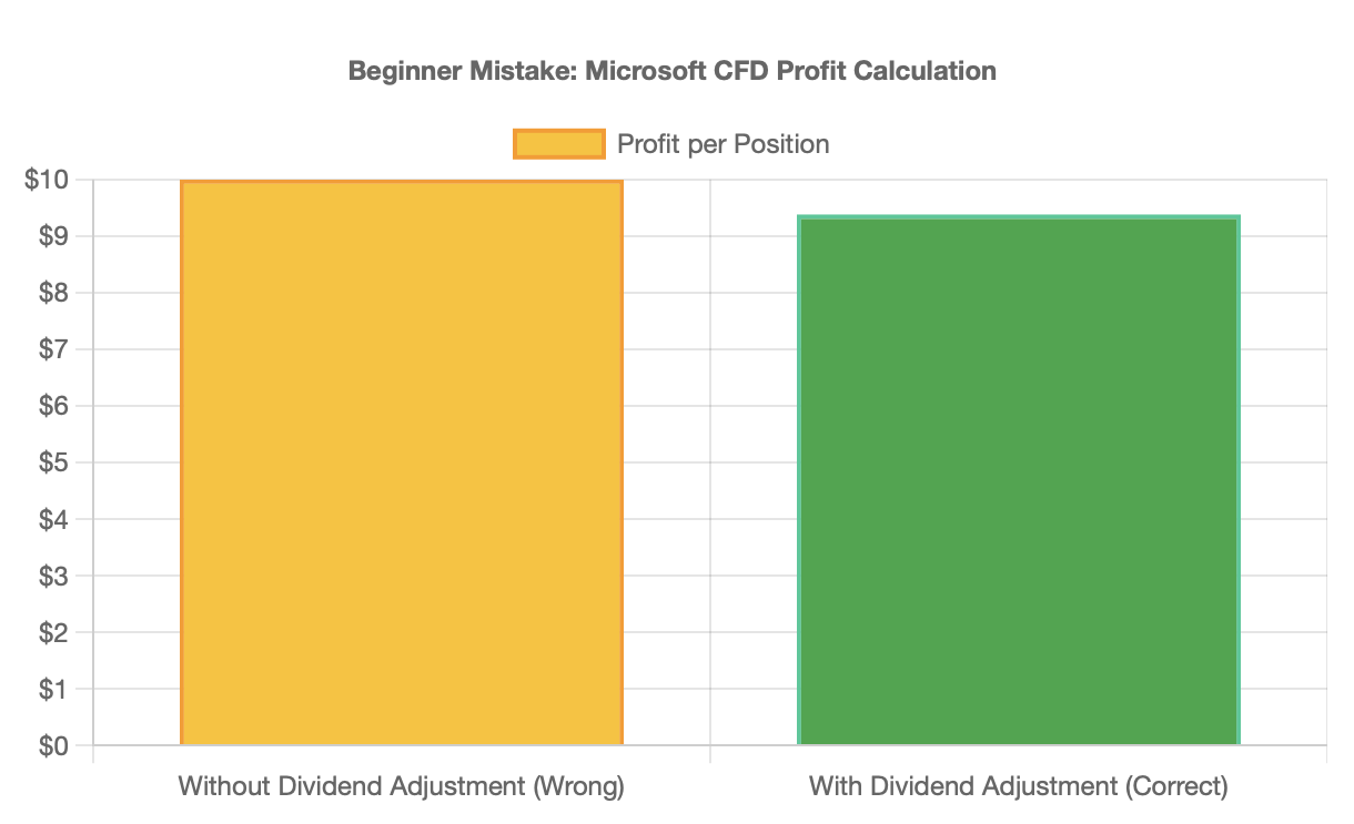 Here’s a real example to show the risk of miscalculating your profit outlook. A beginner opened up Microsoft CFDs at $300. The price moved to $310. He calculated $10 in profit by position, but when he was long held, a $0.62 dividend adjustment occurred on that position. The actual profit was $9.38 by position. This individual made an obvious error and resolved this error by making wrong assumptions on a future position size.