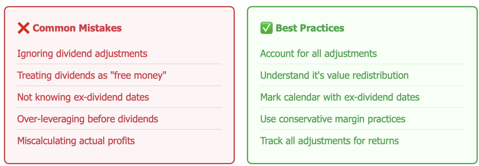 Traders commonly make several significant mistakes when it comes to dividend adjustments. The biggest mistake is simply ignoring adjustments. Accepting dividends leads to profit and loss miscalculations. You think you've earned more than you actually have and/or you think you've lost more than you actually have. Either way, your records are not accurate.