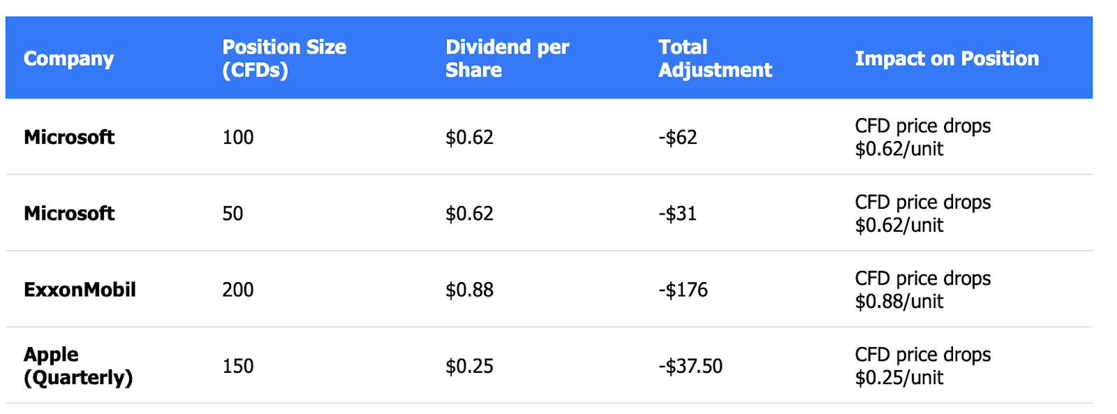 Here's what you need to know. On ex-dividend dates, CFD prices are adjusted downwards by the dividend amount per share. The price reduces by the amount of the dividend, decreasing the value of your position (and profits/losses) by this amount as well.