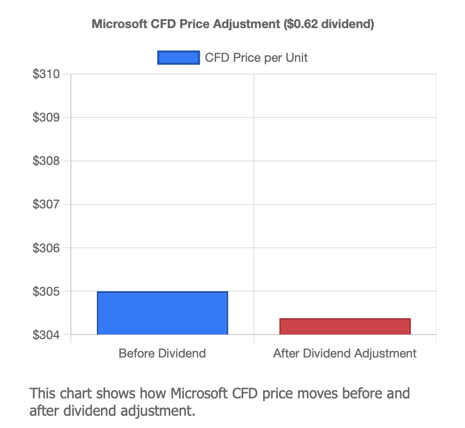 Let's provide an example. Microsoft pays a dividend of $0.62 per share. The Microsoft CFD price is reduced by $0.62 on the ex-dividend day. If you hold 100 Microsoft CFDs, the value of your position is then reduced by $62. This is not a loss, just a price adjustment.