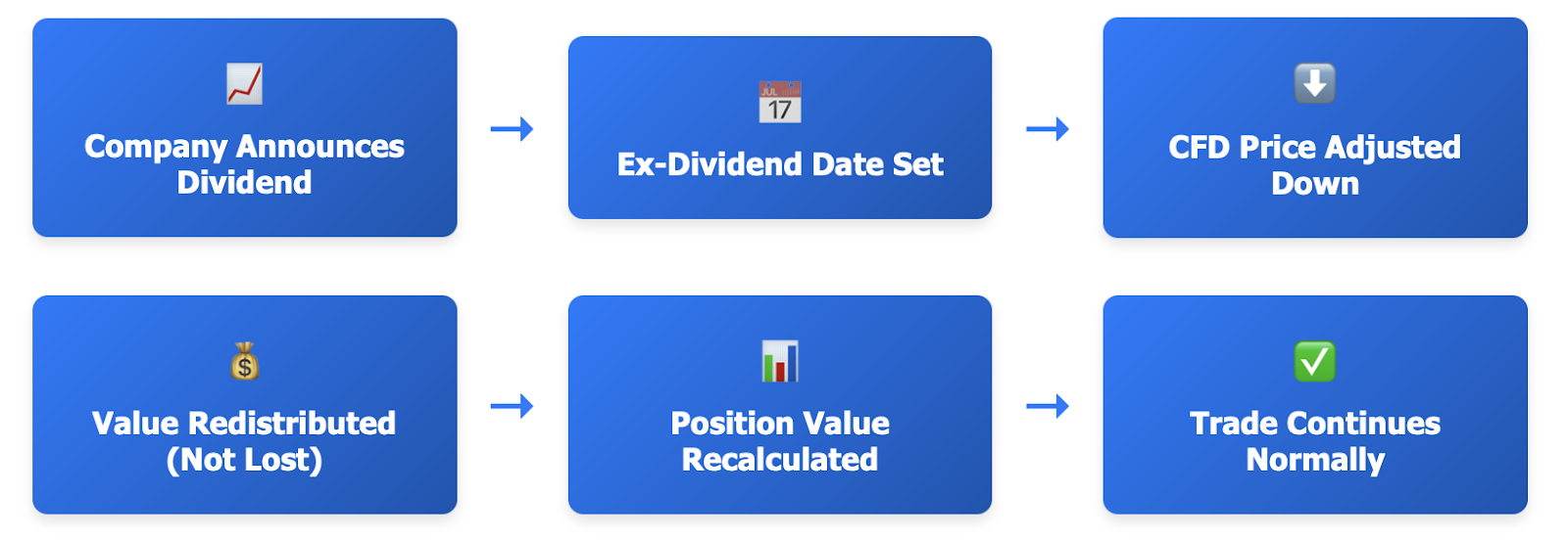 Full-time trading professionals see this adjustment every day. For example, Apple pays a dividend quarterly to all shareholders, when this dividend is executed, the price of the Apple CFD would be adjusted downward by the price of the dividend. If you held the Apple CFD position before the dividend was executed, your account would show the price adjustment immediately. The dividend adjustment of the CFD ensures your CFD position remains fair with the affected stock price.
