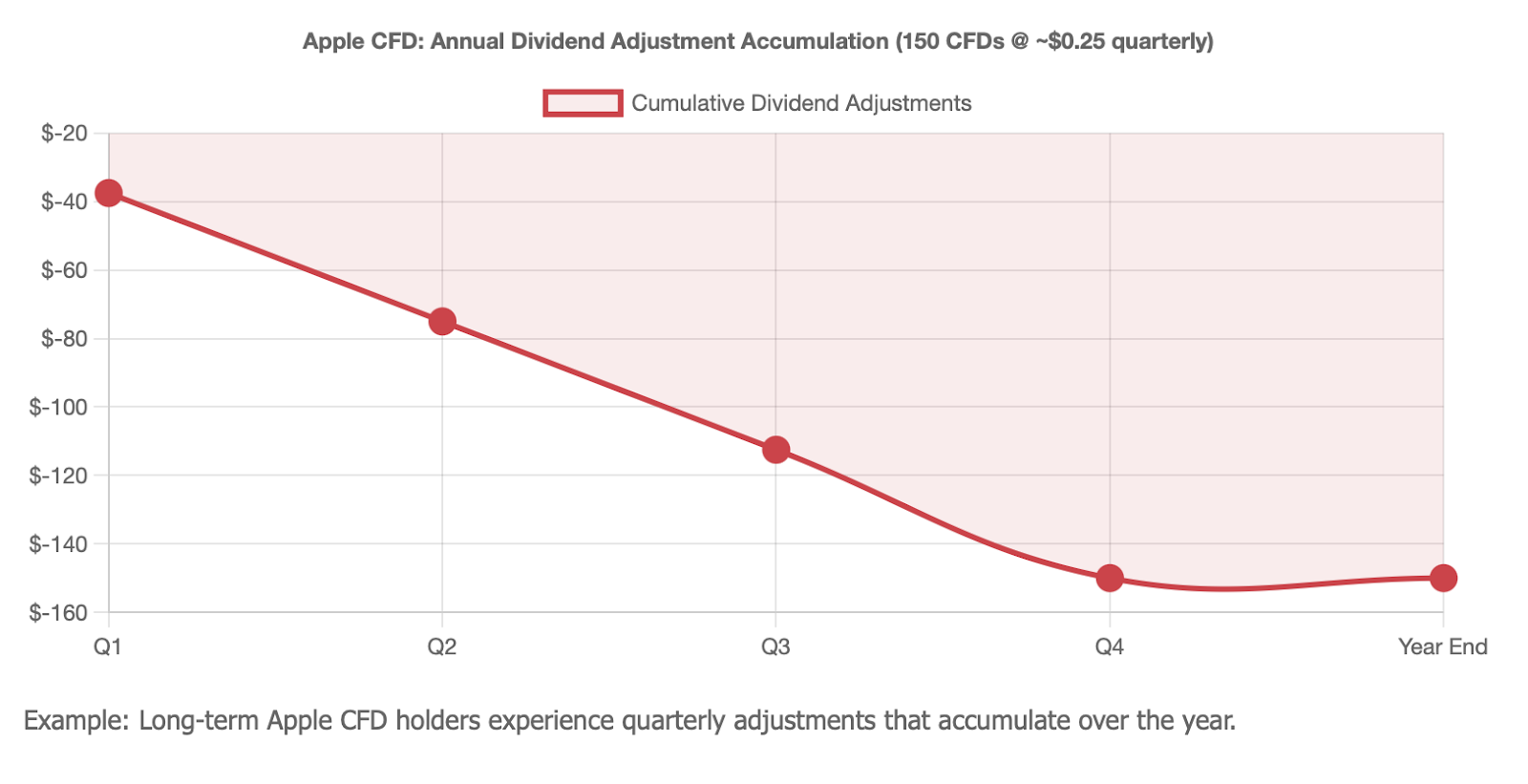 The "Apple" CFDs long-term holding strategy highlights this idea. Apple pays dividends quarterly, and the price drops accordingly each time. It becomes an accumulation effect for the long-term holders. They must also consider those adjustments on their annual returns.