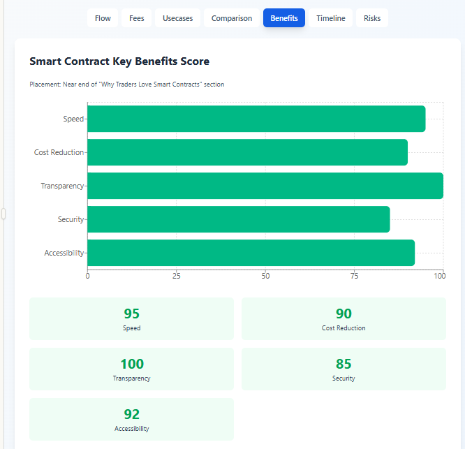 Smart contracts provide three primary benefits. Automation eliminates manual work and human error. Transparency means every action is similarly visible and verifiable. Decentralization removes central points of control and central points of failure.