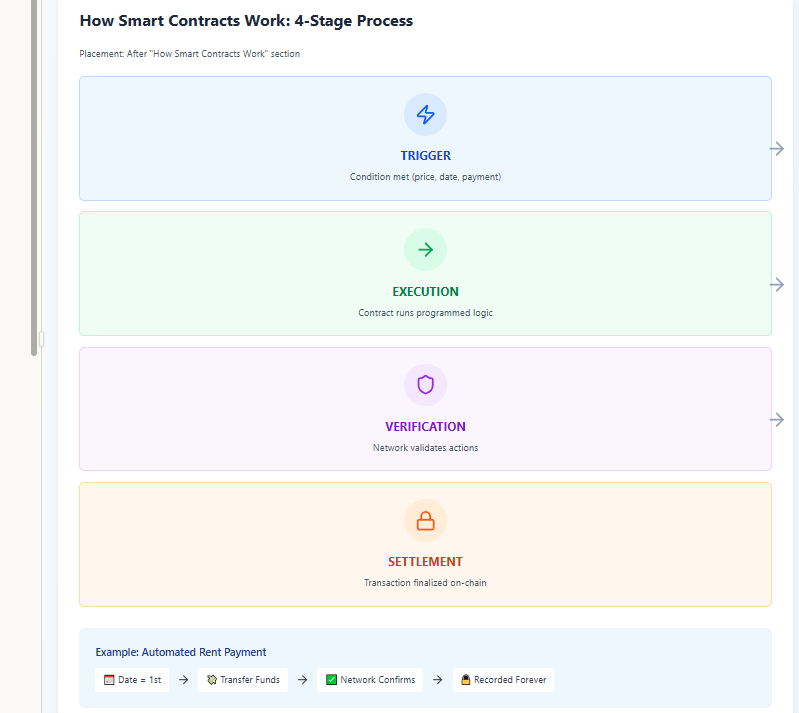 Every smart contract operates by way of a straightforward mechanism. It may be broken down into four stages. Trigger. Execution. Verification. Settlement. If you understand what each stage entails, you will ultimately understand how blockchain automation works.