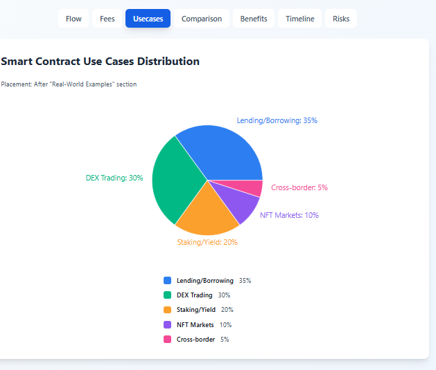 There are five different forms of use cases that showcase the functionality of smart contracts. DeFi lending protocols, such as Save and Compound, automate nearly the entire borrowing experience. Users deposit cryptocurrencies as collateral to borrow funds. Smart contracts can determine how much can be borrowed. Interest rates automatically accrue every block. If the collateral value falls too low, the smart contract liquidates the collateral instantly. There is no intervention of loan officers, no approval process, and no human-led risk assessment. Decentralized exchanges massively changed the issuer of trading. Uniswap and PancakeSwap use automated market maker algorithms in which liquidity providers deposit pairs of tokens into a pool. Smart contracts calculate prices based on the ratio of tokens in the pool. Users can trade tokens directly from the pool, while smart contracts handle price discovery, executing trades, and distributing fees - all automated. Staking and yield farming help to build passive income through smart contracts. When users stake tokens, they lock their tokens in a smart contract. Smart contracts then automatically calculate and distribute rewards. Some protocols even automatically compound earnings when staking. It is like letting it run itself and earn money, as it operates 24/7 and at 100% accuracy.