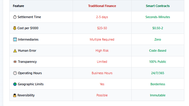 Settlement happens in real time. Financial institutions take several days to settle transactions; Smart contracts execute and settle transactions within seconds or minutes! This reduces counterparty risk; Once the transaction is confirmed, it is complete.
