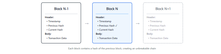 The Concept of the Chain: Each block is linked together by cryptographic hashes. Each new block contains a hash of the previous block, and it would be impossible to break this chain. If a person attempts to alter any of the old blocks, the hash would change, breaking the chain of blocks, and the entire network is alerted. This design, for many reasons, makes blockchain incredibly secure and practically impossible to alter in the past.