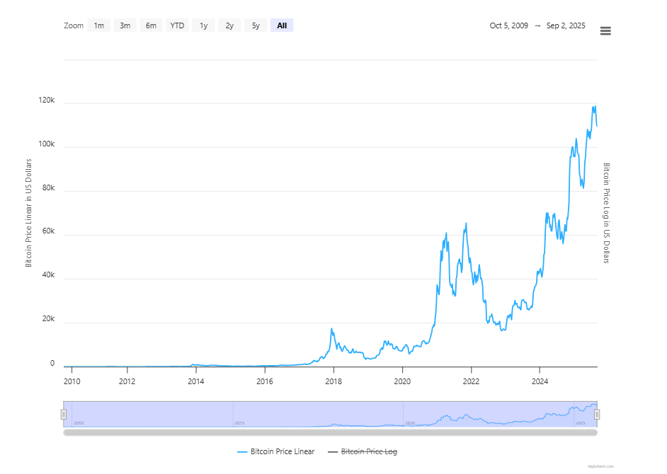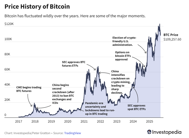 Cryptocurrency markets have been extremely volatile in the short term, but the long-term investment returns have been very fruitful. Bitcoin and Ethereum have each seen several ups and downs. For instance, Bitcoin’s major bull runs occurred around 2013, 2017, and 2021. After reaching $1,000 in 2013, it fell back, then shot to nearly $20,000 by the end of 2017. Similarly, after the 2017 peak, it plunged (under $4,000 in 2018) and then rallied to an all-time high of around $69,000 in late 2021 and in 2025, it reached an all-time high of $109,000.