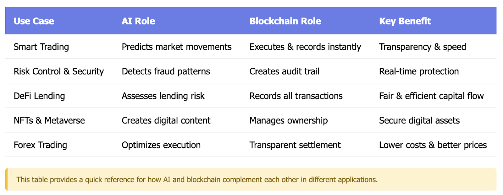 Risk Control and Security have also been transformed through the combination of AI and blockchain. AI-based systems can detect scams and unusual behaviour patterns in real time and can catch fraudulent activity sooner than any human team can. Blockchain technology can permanently record these security events and create an inviolable audit trail. If things go badly, you have an unalterable timestamp of when and what happened during the security breach.