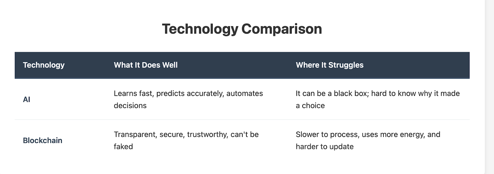 Artificial intelligence is about machines that think. AI learns from data, sees patterns humans might miss, and makes predictions that improve over time. Blockchain, on the other hand, allows data to be trustworthy. Blockchain creates permanent records that cannot be changed, and it does so without a centralised entity having to make decisions.