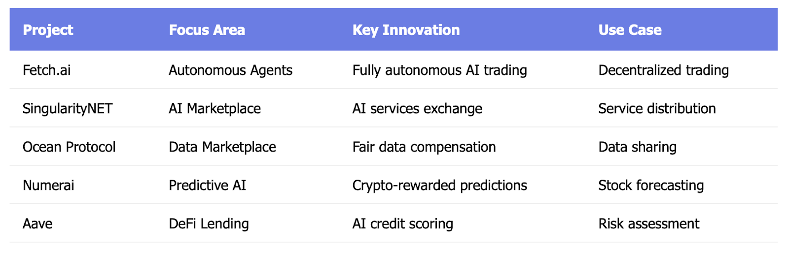 Fetch.ai is creating a platform for fully autonomous AI agents to negotiate and trade autonomously with each other. Numerai allows data scientists to train AI models to predict future stock prices, and the Best model predictions are rewarded with cryptocurrency. A major player in the DeFi space, Aave, is looking at credit scoring via AI to increase the safety and efficiency of lending.