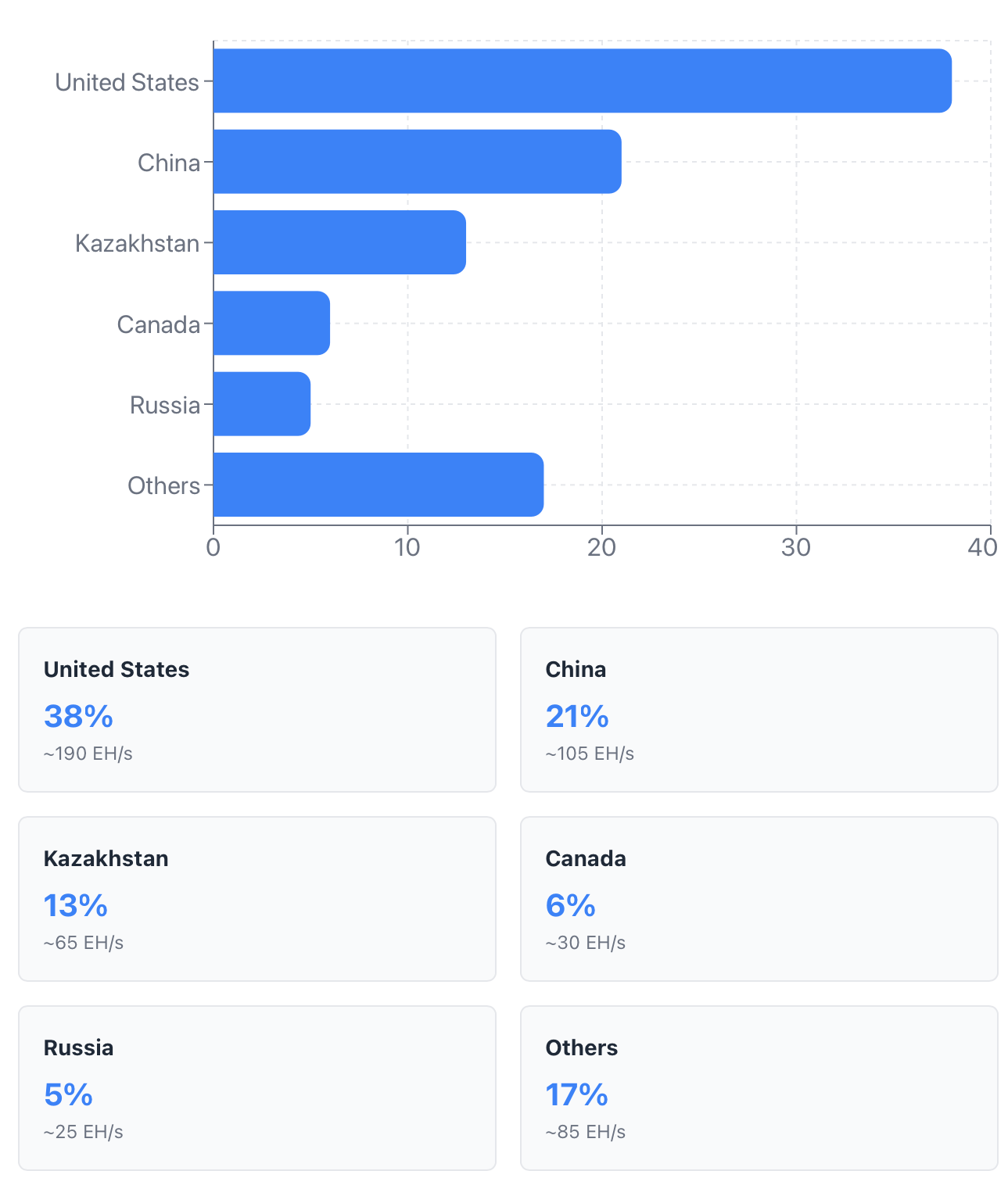 Currently, the United States has the highest hash rate distribution globally. This has been especially augmented since China's ban on mining operations in 2021. States such as Texas, with great energy resources and welcoming policies toward mining, have attracted substantial mining activity. Other notable mining countries include Kazakhstan, Canada,  Iceland, and Russia, which host substantial mining operations with each providing their own unique advantages.