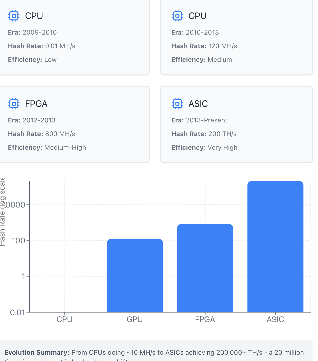 The narrative about the story of mining hardware is one of continuous advancements and increasing specialization. Recognizing how different devices work, then, helps to allow for an explanation of how hash rate has achieved such massive gains, and the challenges to that growth.