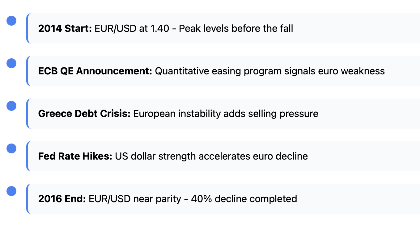 The euro's decline against the dollar created one of the most persistent trends in modern forex history. The pair started off at 1.40 in 2014, and fell unstoppably until it reached parity around 2016.