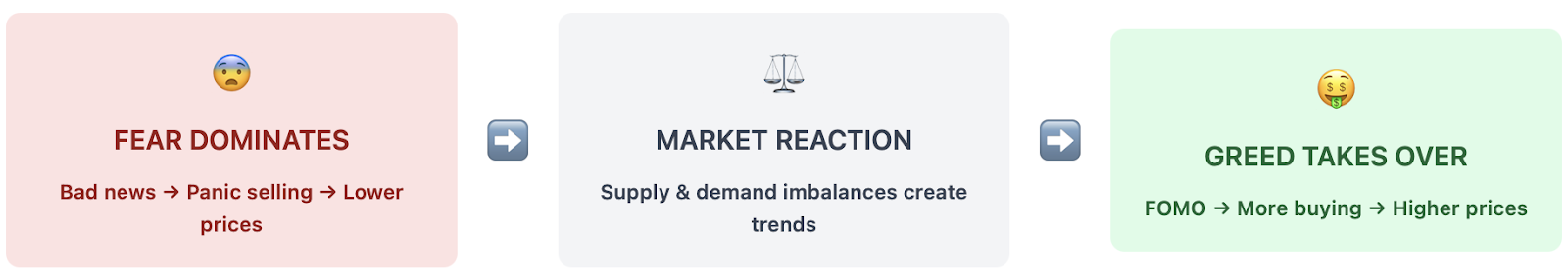 Fear dominates when markets are in downtrends. Bad news strikes, you see prices decline, selling takes place, and panic selling begins. As sellers create more and more sell waves, each wave breeds fear in the market, which sparks additional selling. You can see this cycle operate in graphic detail in the 2008 financial crisis.