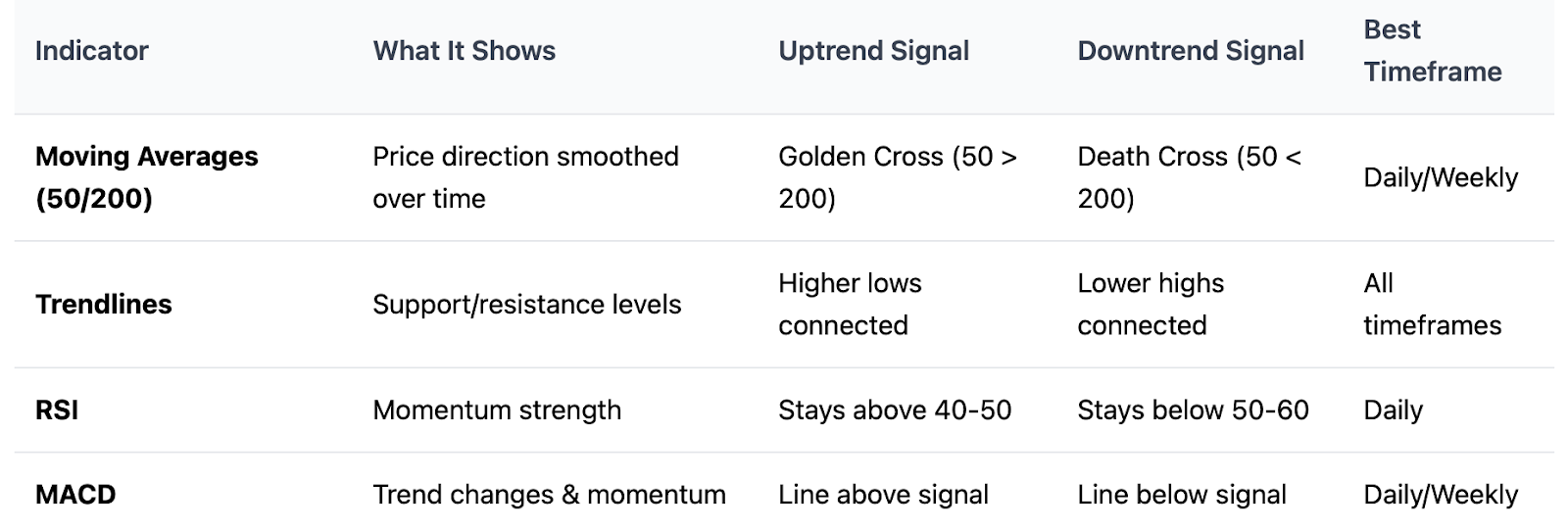 Putting It All Together Professional traders look for multiple confirmations. They will wait until price has broken a trendline, the 50-day MA has crossed above the 200-day MA, and the RSI shows bullish momentum before entering their position. All of these confirmations together give the trade a better probability of success and lower the chance of false signals.