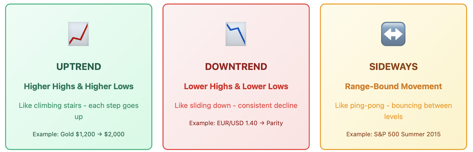 This guide will break down everything you need to know about market trends: the three major types (uptrend, downtrend, and sideways), how to identify them, navigate market trends with proven tools, and teach real strategies. By the end of this guide you will be thinking like a professional trader and be looking for opportunity in what at first seems like chaos.