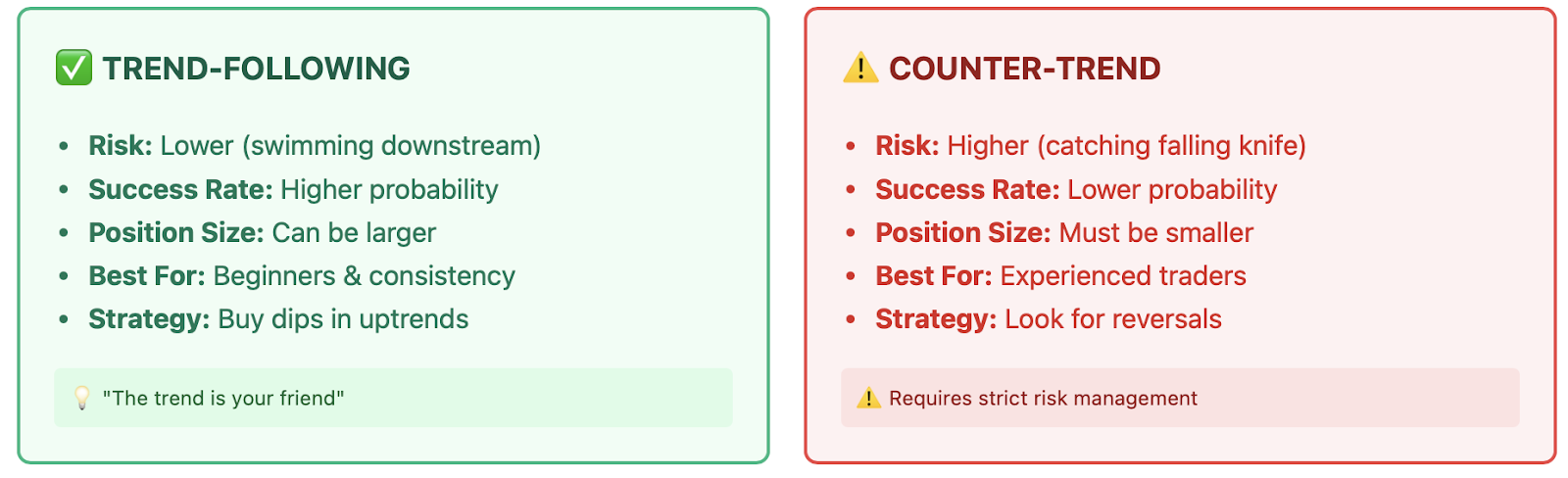 The fundamental difference between trend-following and counter-trend trading is the fact that trend-following allows you to increase position size, as you are trading with the odds in your favor, while counter-trend trading requires smaller position size because it is much riskier. No matter how strong a trade setup looks, never put too much risk on a trade.