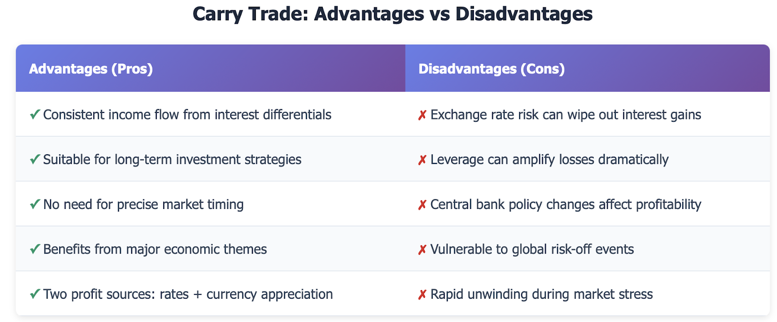 Carry trading has several unique advantages that can be appealing to both retail and institutional traders. The primary advantage of a carry trade is consistent income flow. Unlike trading strategies that require precise market timing, carry trades can create a steady cash flow as long as interest rate differentials favor the position.
