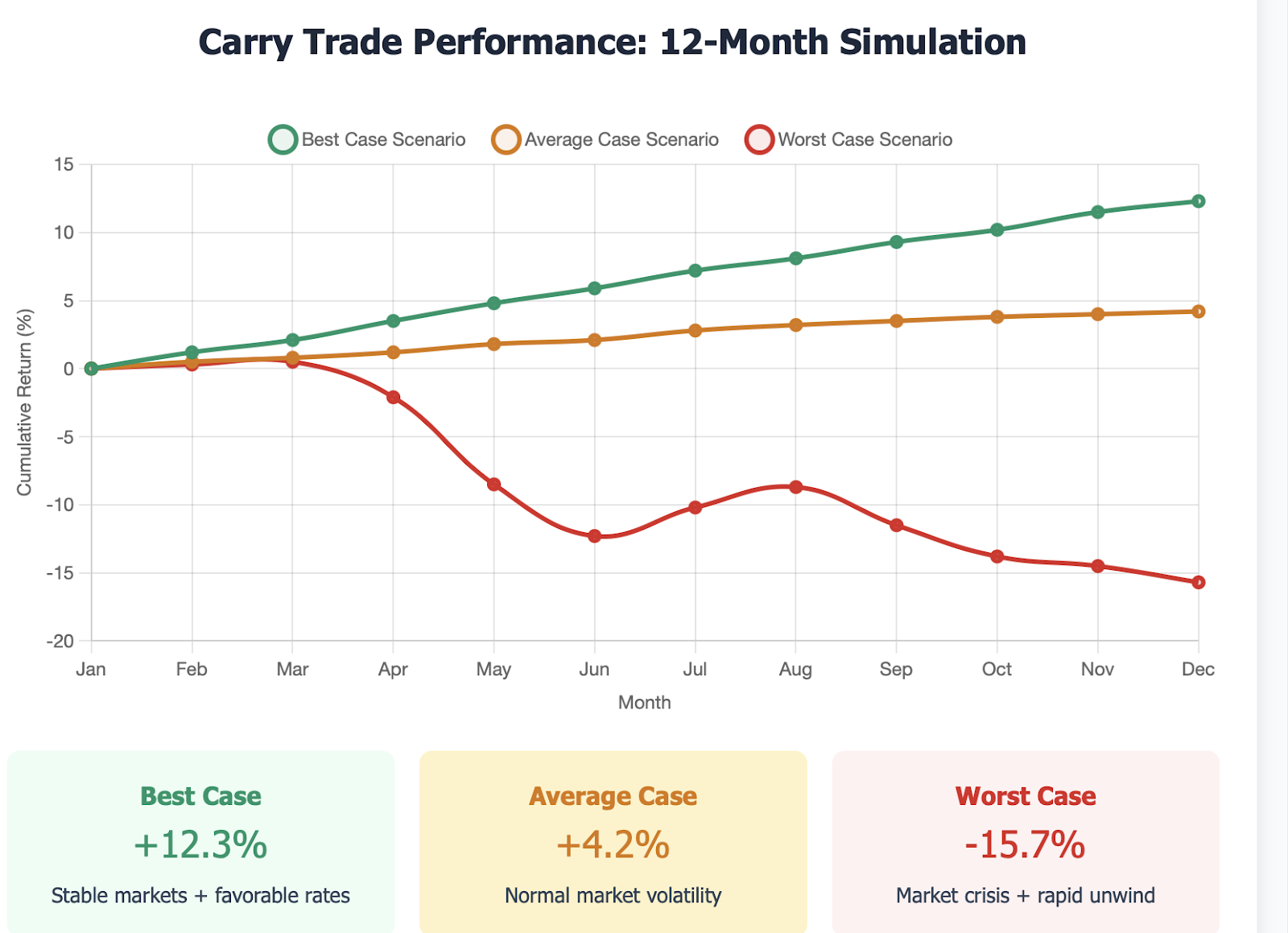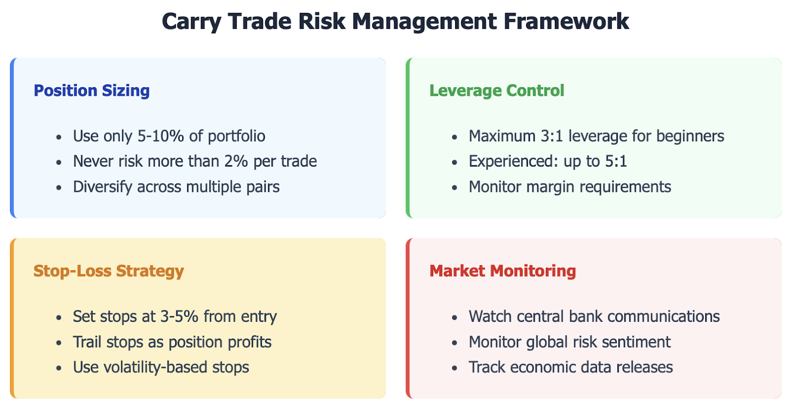 Risk management distinguishes successful carry traders from those who incur trading losses. This means stop-losses must be set to limit downside exposure, leverage must be controlled to maintain sustainable levels, and macroeconomic conditions must be constantly monitored for the potential to trigger an unwinding of carry positions.