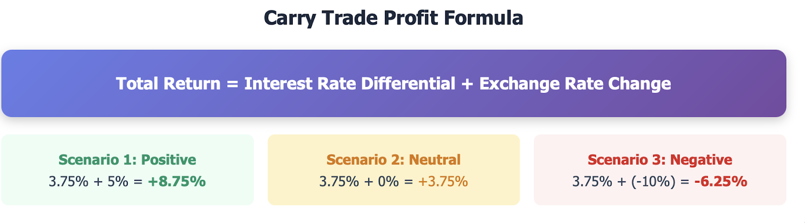 The profit formula looks this way: Total Return = Interest Rate Differential + Exchange Rate Change