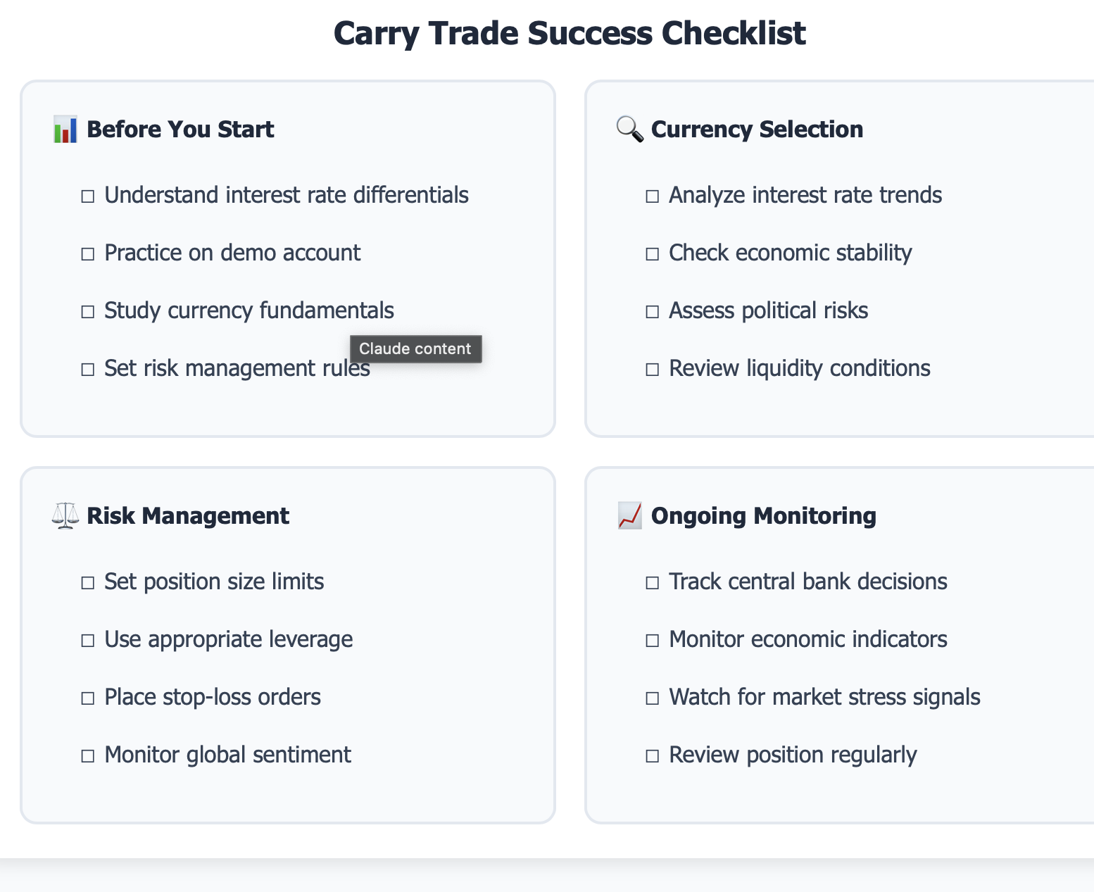 Performing carry trades successfully requires more than finding interest rate differentials. You also need to have a systematic plan that incorporates: fundamental analysis, proper risk management, and realistic expectations for the potential returns and possible draws.