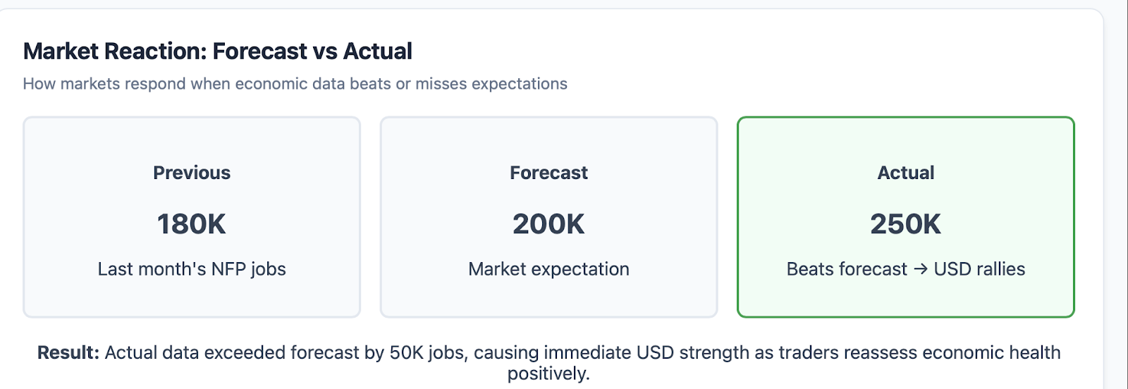 Here's where it gets interesting: assume NFP forecasts were to announce 180,000 new jobs, however, the actual number is 250,000. The dollar rallies; the market is happy, or has priced in the economic strength of the economy because they perceive the NFP as better than expected. However, if, for example, only 120,000 jobs were created, the dollar generally weakens since traders assess that the economy is weaker than perceived.