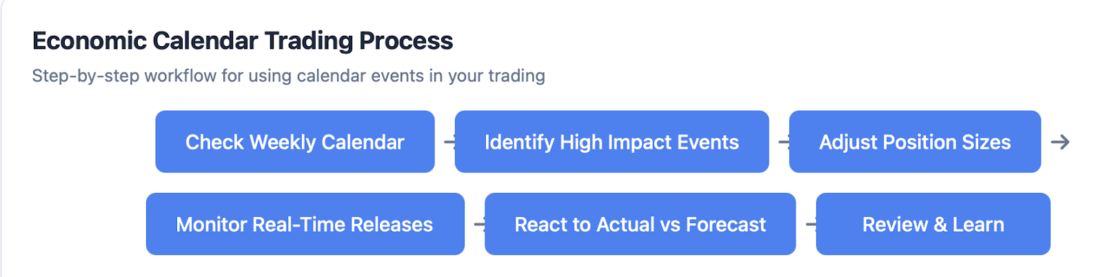 The Economic Calendar is not just for keeping track of upcoming events, it is tactical, and used for thoughtful, informed decision making in your trading process from start to finish.